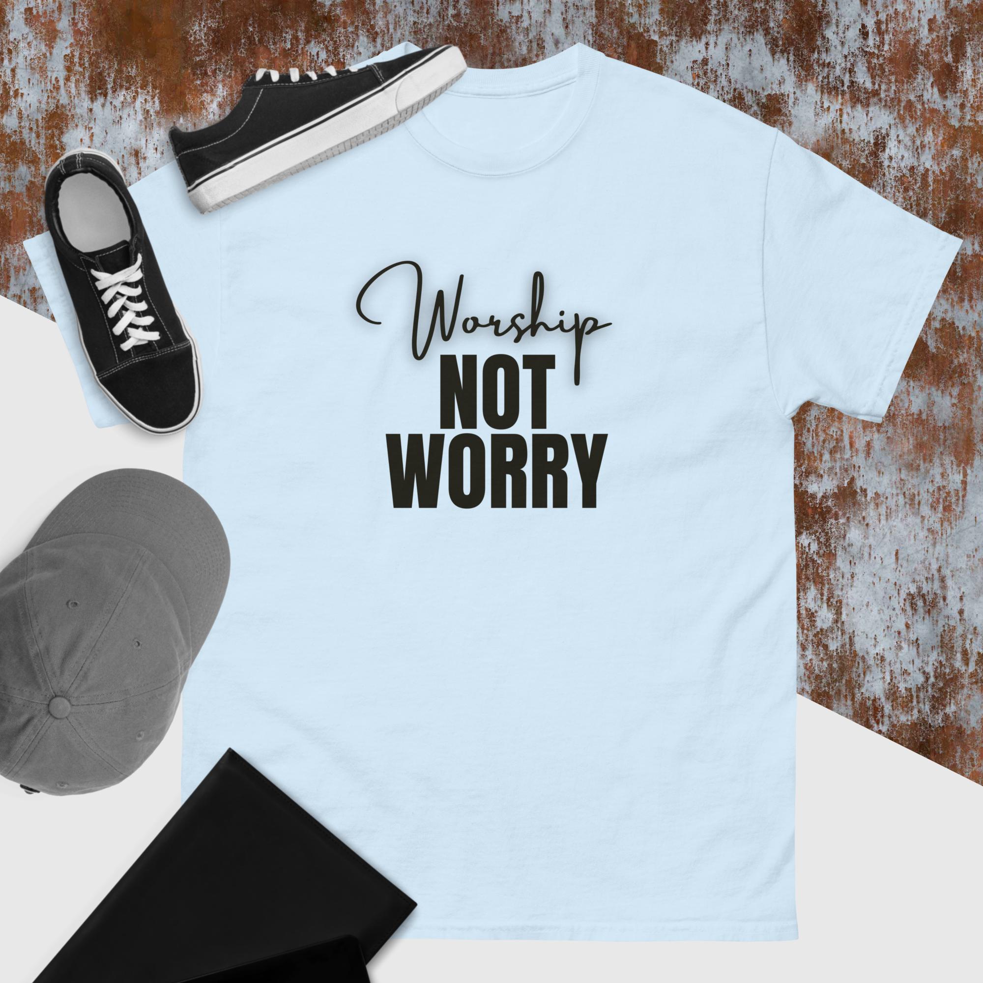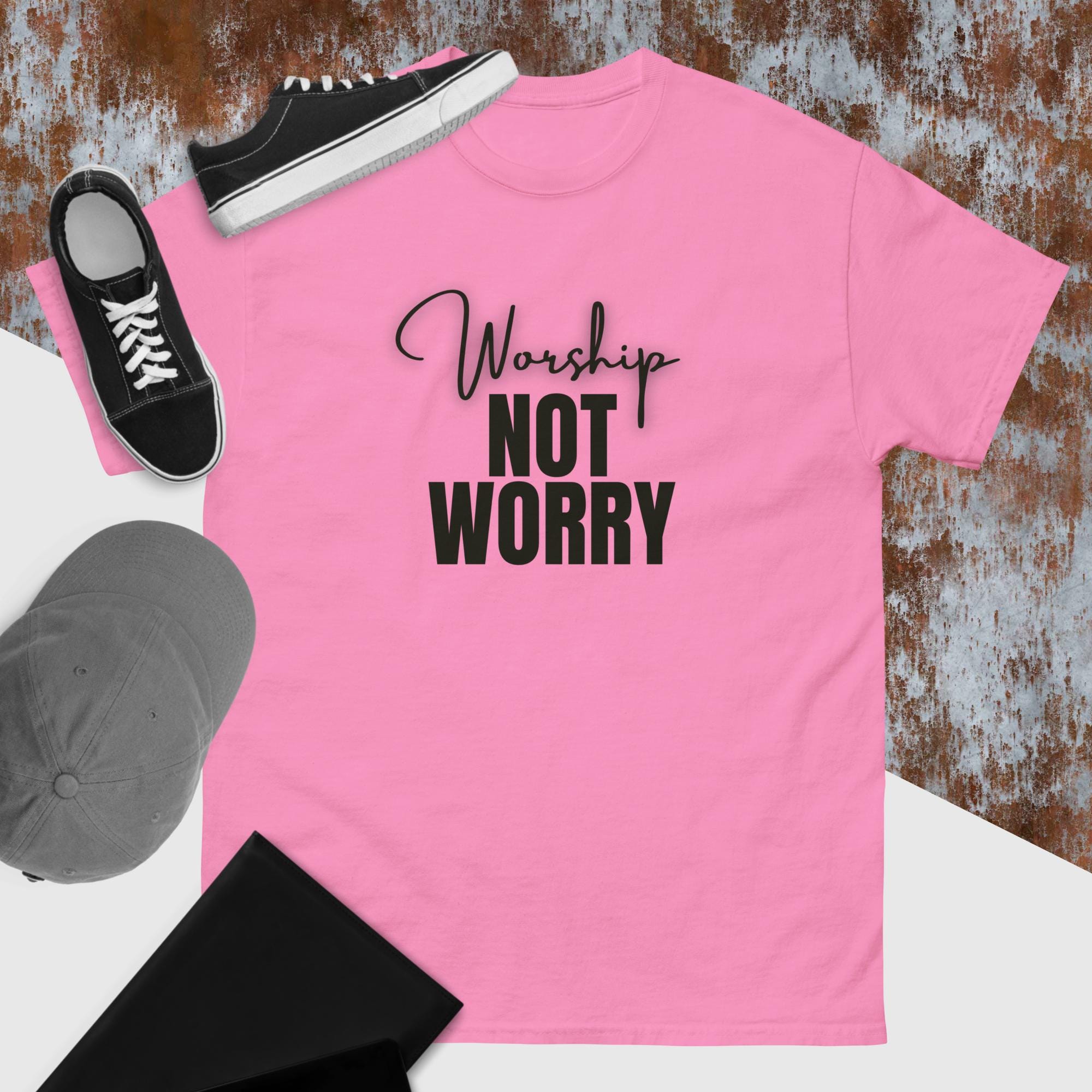 Elevate your faith and your style with this Worship Not Worry tee. Crafted from 100% cotton for a comfortable and durable fit, this unisex classic tee offers a structured look that complements any layered streetwear outfit. Designed to hold its shape and make a bold statement, it reminds you—and everyone around you—that worship always wins over worry.