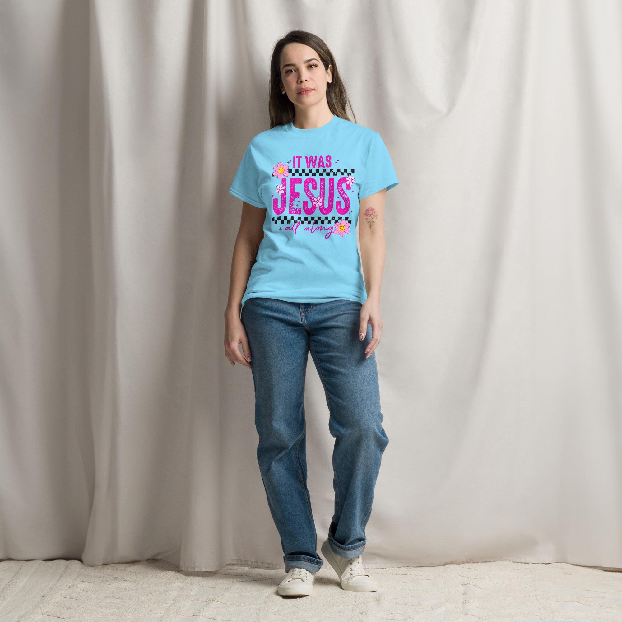 This “It Was Jesus All Along” tee says what your heart already knows—through every season, every breakthrough, and every blessing, Jesus was right there. With a retro vibe, playful daisy flowers, and a pop of hot pink, this shirt brings joy, faith, and 90s flair all in one.