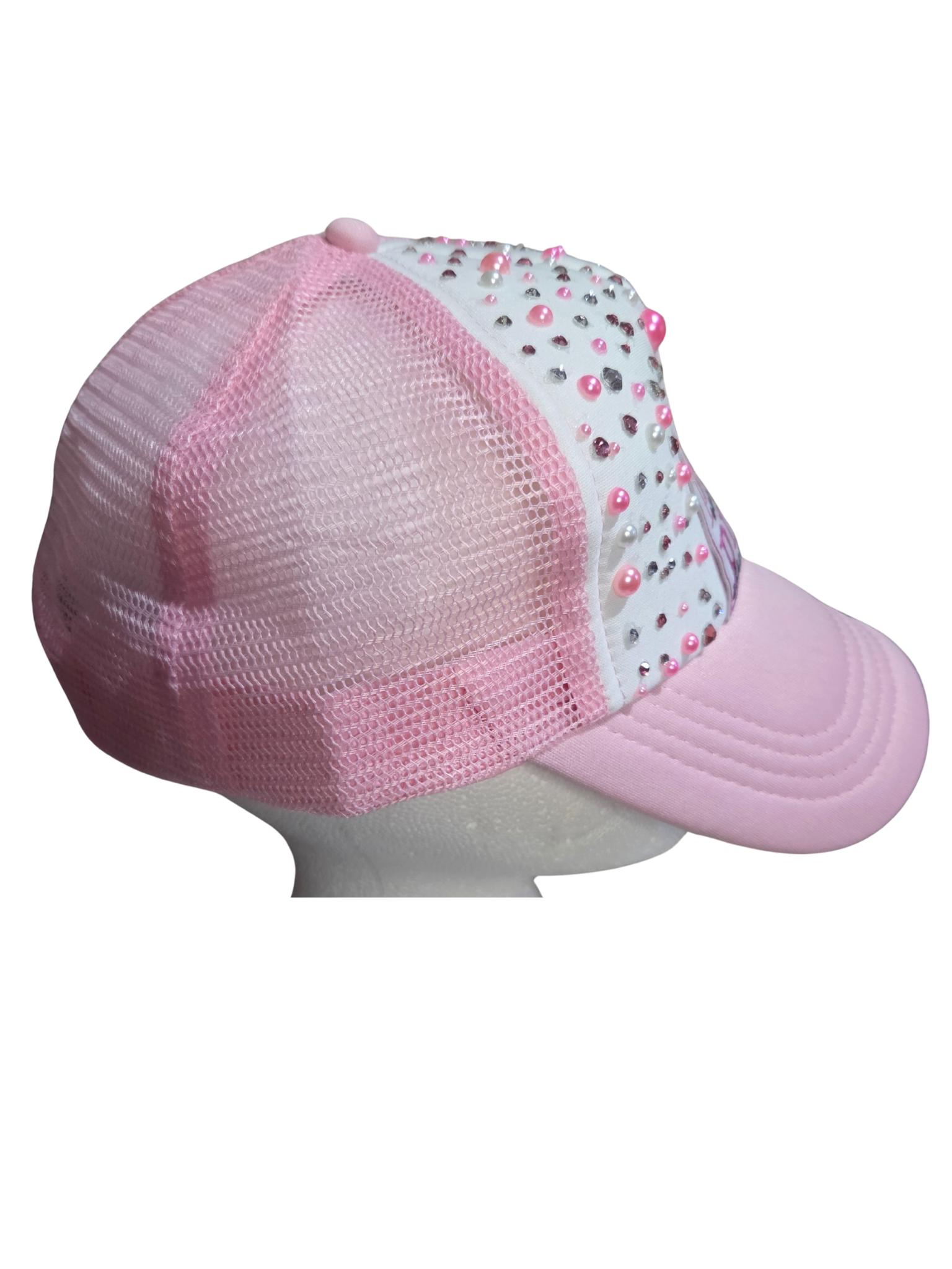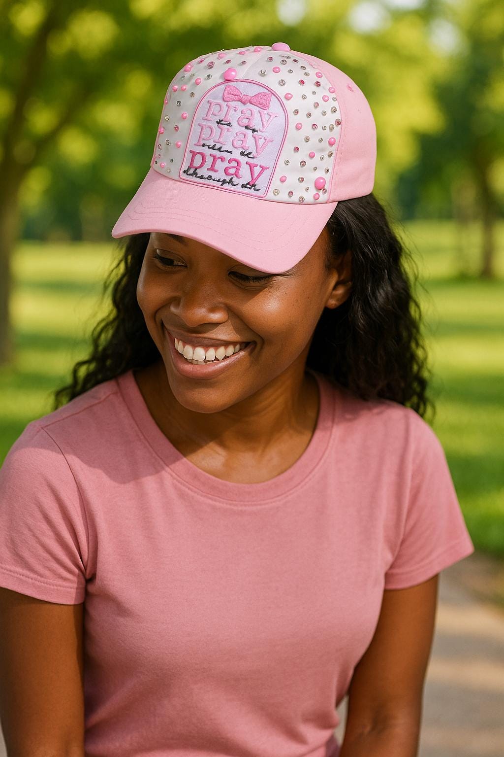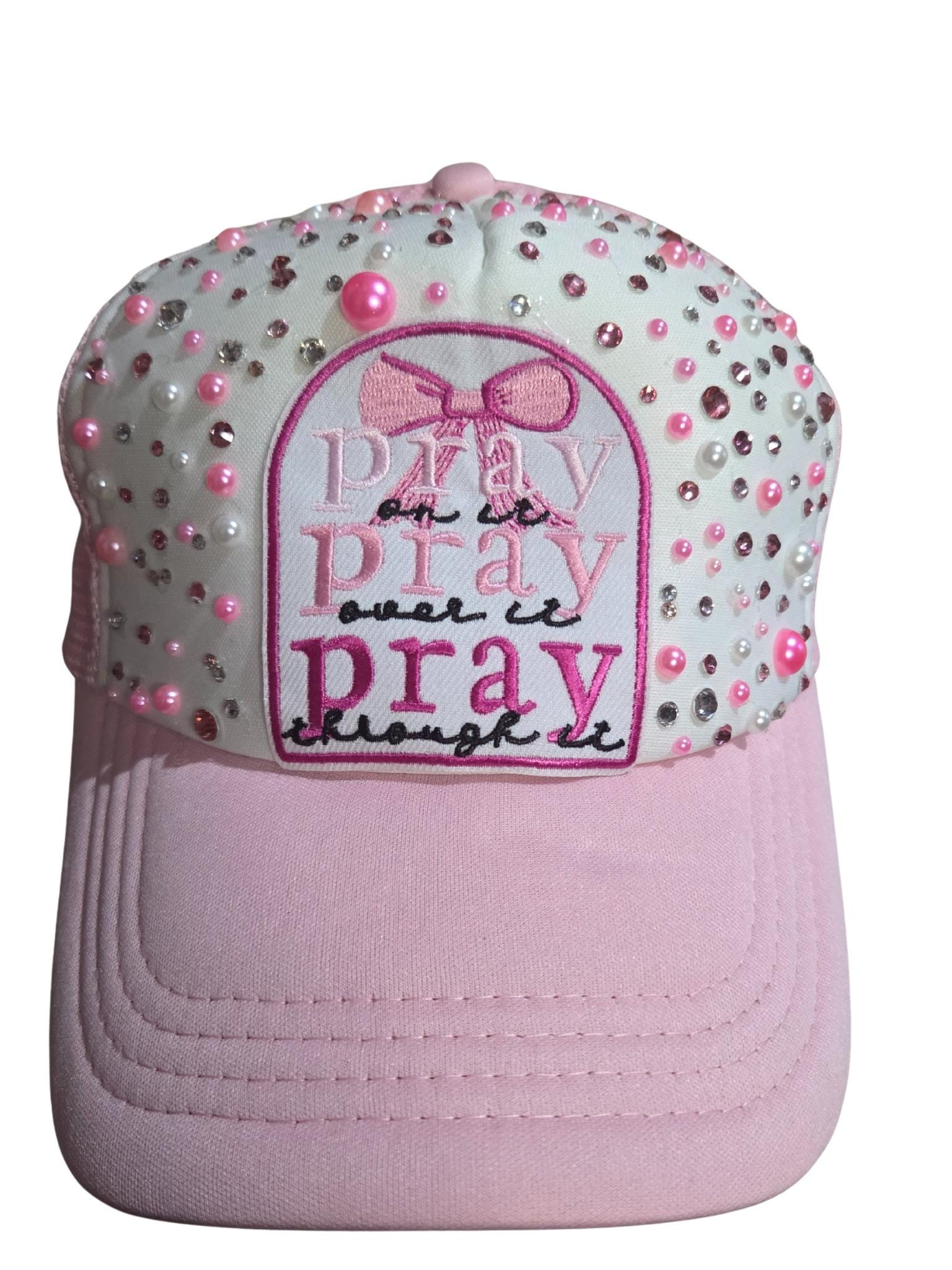 Shine your faith in style with this beautifully hand-decorated “Pray On It, Pray Over It, Pray Through It” hat! 💖 This pink and white cap features sparkling rhinestones and pearls for the perfect mix of glam and grace. Made with care and attention to detail, it’s a daily reminder to keep God at the center of it all.